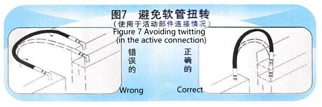 8.软管组合件在相同的水面出现移动或弯曲,通过合理的安装来避免软管扭转。(见图7)