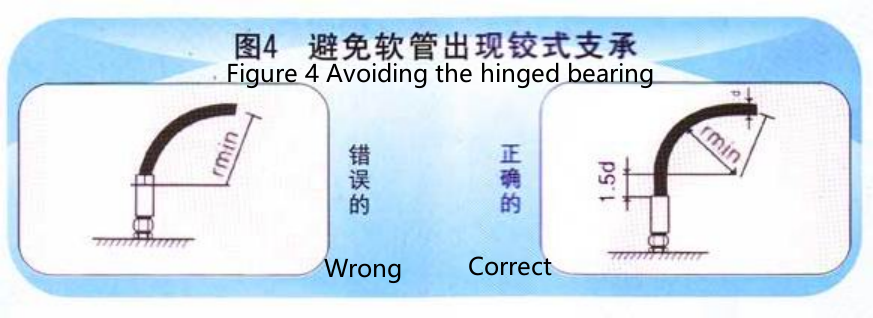 5.在弯曲安装时,软管弯曲半径应当在1.5d(d为软管直径)的长度上开始,否则出现铰式支撑。(见图4)